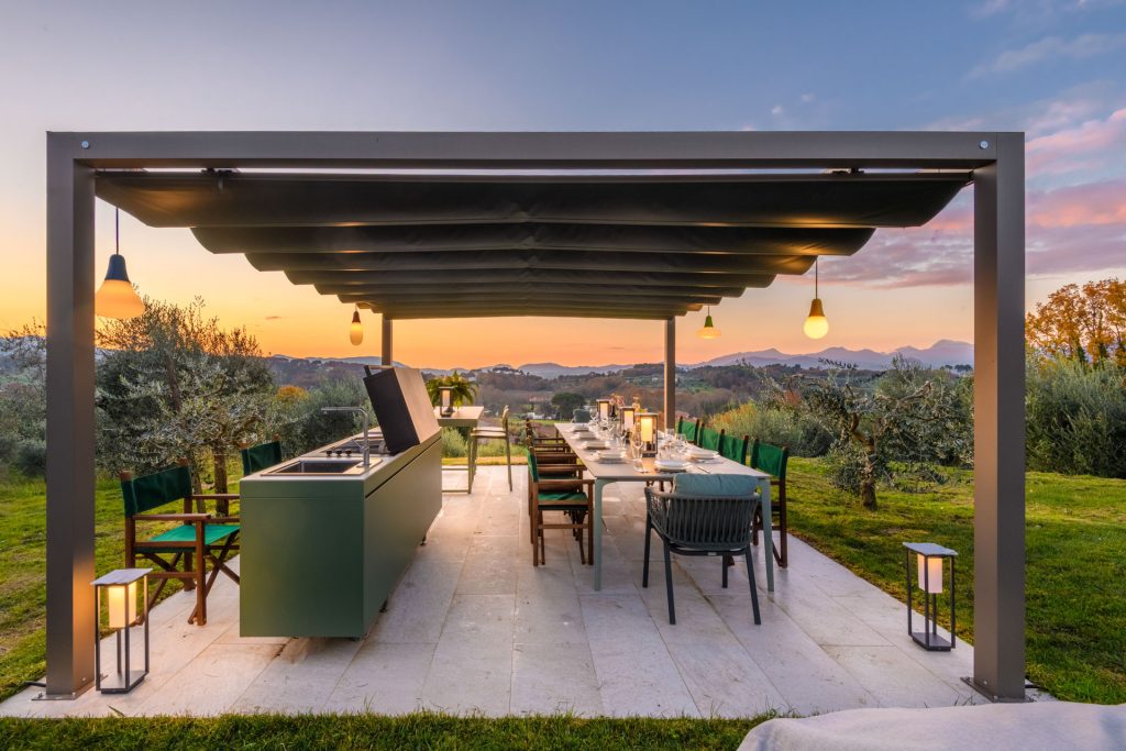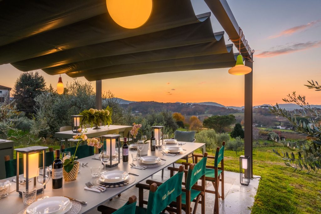 Views of rolling hills, lush vineyards and cypress groves, a gorgeous panoramic pool, charming bespoke architecture—if you’ve dreamed of it, Villa San Martino has it. Originally built in the 16th century, this eight-bedroom stone farmhouse villa was recently renovated and it is now featuring modern furnishings and modern amenities. Use the villa as you would your own home in the Lucca countryside by the medieval hamlet of Montecarlo—there’s even a private SPA and a grand panoramic terrace for outdoor dining with a magnificent view. The pergola-covered terrace is the perfect spot to sit, dine and enjoy the fresh air, and lush terraced gardens lead down to the infinity pool overlooking the estate