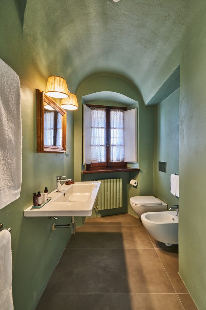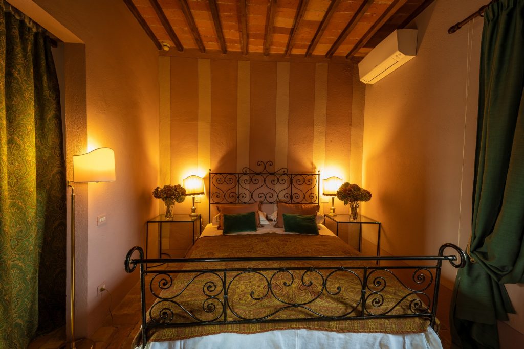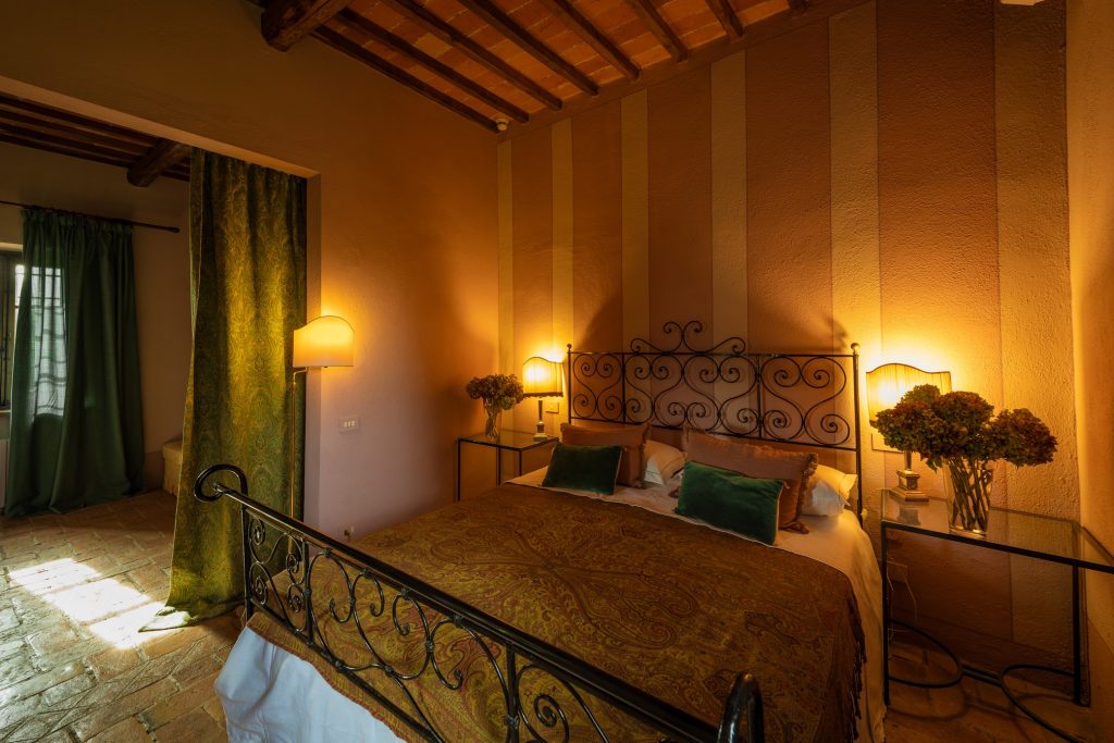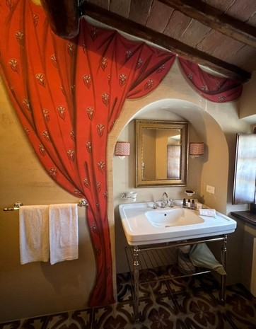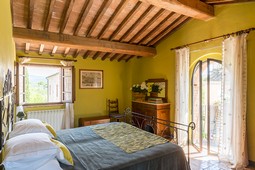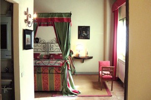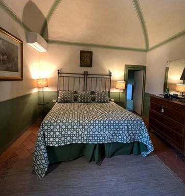 Spacious suite with private entrance, off garden or through Cantinore, to large living room with several handsome paintings, fabric-draped tables and sunflower yellow couch. Door leads to double bedroom (queen) with restored antique iron bed, traditional to Tuscany, finished in red cotton and closed off from adjacent sitting area by means of red and gold plaid drapes. Two white-tiled bathrooms (tub with wall-mounted shower, partition in each) with views of the countryside.