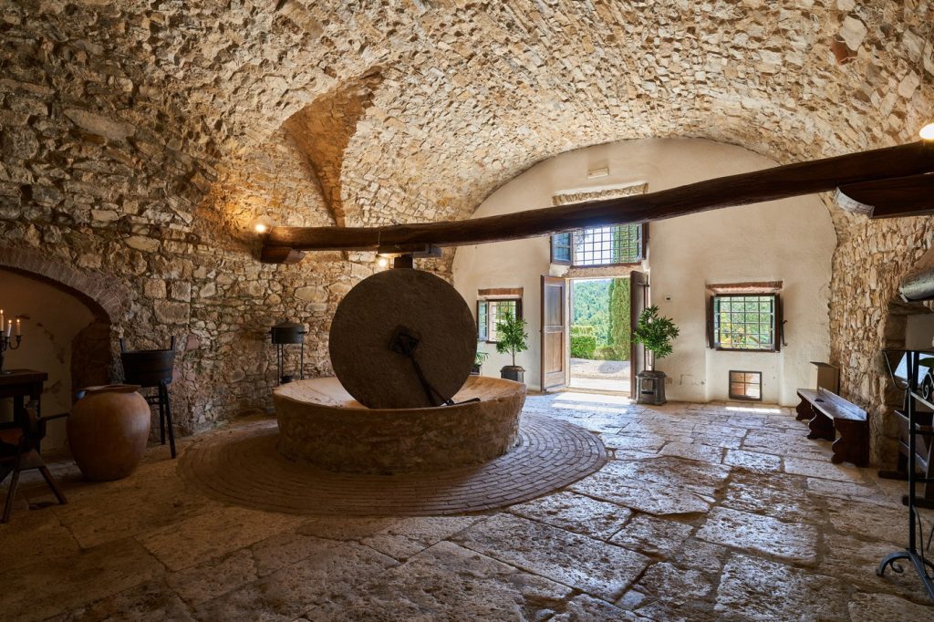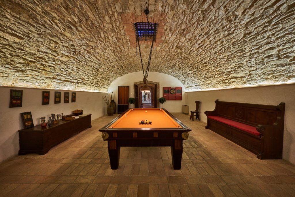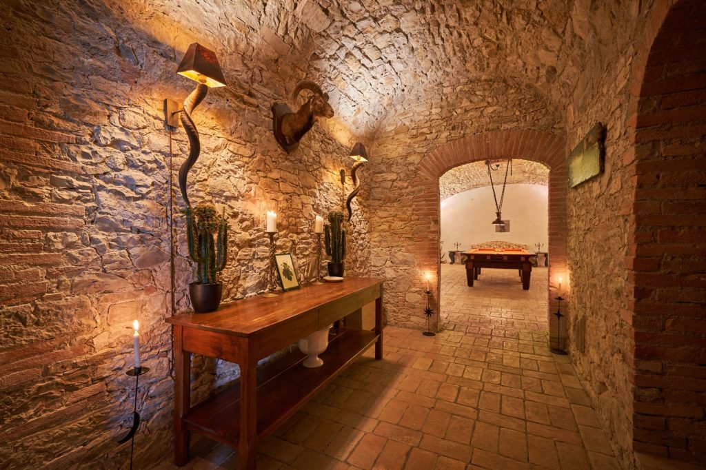The lower level of the house has been restored but the ancient olive press, originally powered by oxen, remains. Beyond is the large billiard room, with a beautiful, full-size antique pool table. The Cantina is set in two small round rooms, and includes wine of the house. This museum-like series of rooms, set with various interesting artifacts from the estate’s agricultural past, is also reached by a separate gated entrance and gravel drive.