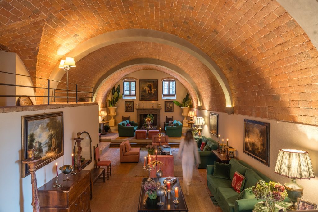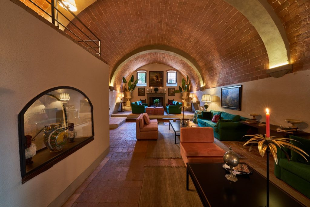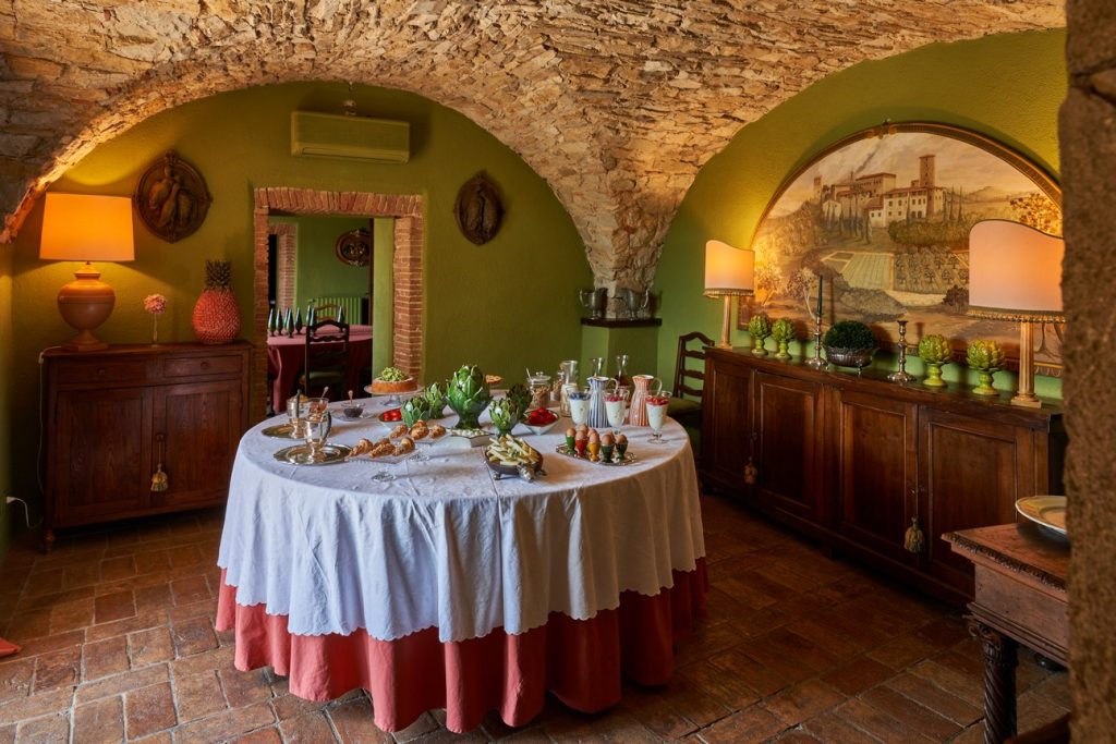Vast living room, the ‘cantinone’, in an apple green and velvet-red color scheme with several sitting areas, all furnished with handsomely upholstered couches, antique sideboards and table lamps. The cotta floor is softened with tapestry rugs, and several cleverly placed floor ‘windows’ offer tantalizing views of the Cantina below. The walls are hung with oil paintings. The arched ceilings remain bare terra-cotta. Even in summer, this room remains a cool oasis, rarely needing the air conditioning. CD player and karaoke machine.
