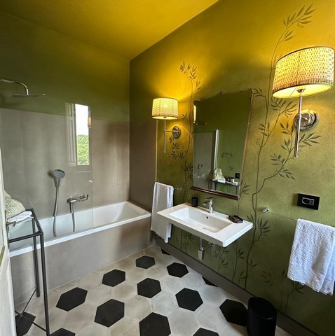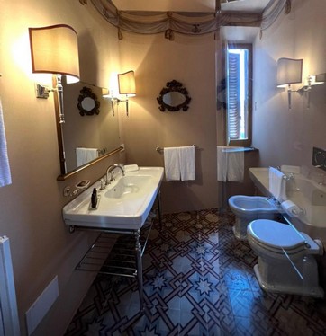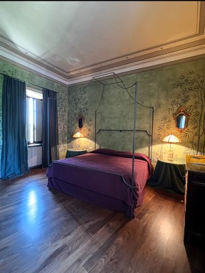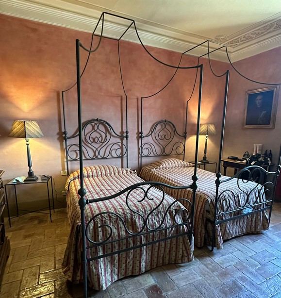 Private suite of two rooms occupying the end of the hall comprises the ‘Popes’ room, a double bedroom (twins cannot combine) in sophisticated beige/coral damask stripe with a wonderful oil of a Pope. Across the frescoed hall, depicting the town of Gallina and Villa Collalto as it looked at the turn of the century, is the private bath (tub with hand-held shower, partial partition).