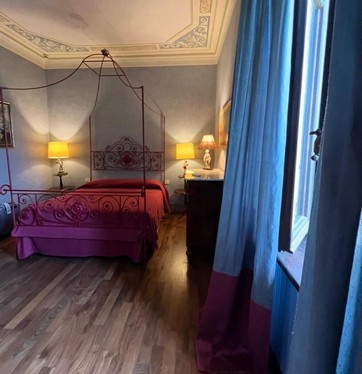 Cool and pleasant double bedroom (queen), ‘azzure’, with restored iron bed draped in white linen and finished with fresh white cotton spread. Blue and white color scheme taken from handsome frescoed ceiling. Hardwood floor, armoire and dresser. Blue and white ensuite bath (enclosed shower stall).