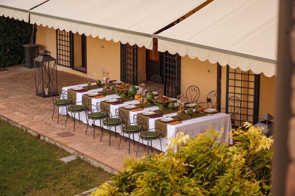 Open carpark set out of sight next to the tennis court. A garden of 1 1/2 hectares immediately surrounds the house with fruit trees, flowering shrubs, roses, flowering vines and cypress trees. There are characteristic views of green-covered hills, olive groves and vineyards from virtually every vantage point on the property. Following around to the south facade, a broad paved patio, with barbeque, is furnished with iron tables and chairs for 36 people and can be arranged to suit the size and configuration of each group. Retractable awnings provide shade when needed. Five mountain bikes are available for clients’ use — a particularly amiable way to go to Pievescuola. A croquet lawn is also available for everyone’s amusement.